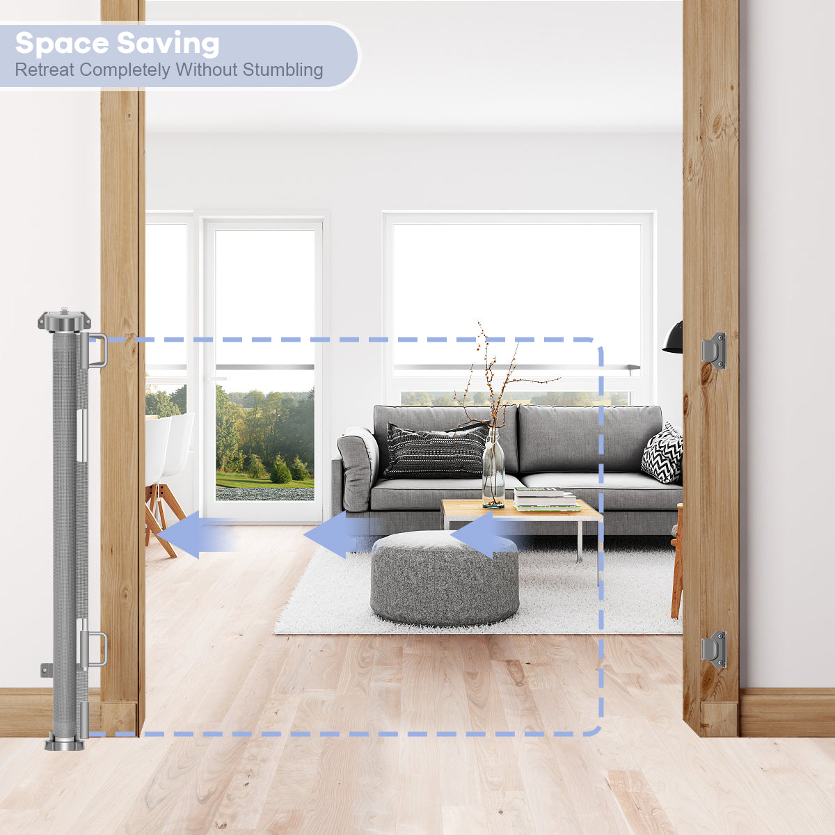 - One-handed operation—The retractable baby gates with door is easy for you to operate one-handed, since — real talk — you’ll probably be holding a baby in your other hand. For more convenience, the locking mechanism for safety is also easy to do with one hand that you just need to push to unlock, but your kid can’t do anything with it.