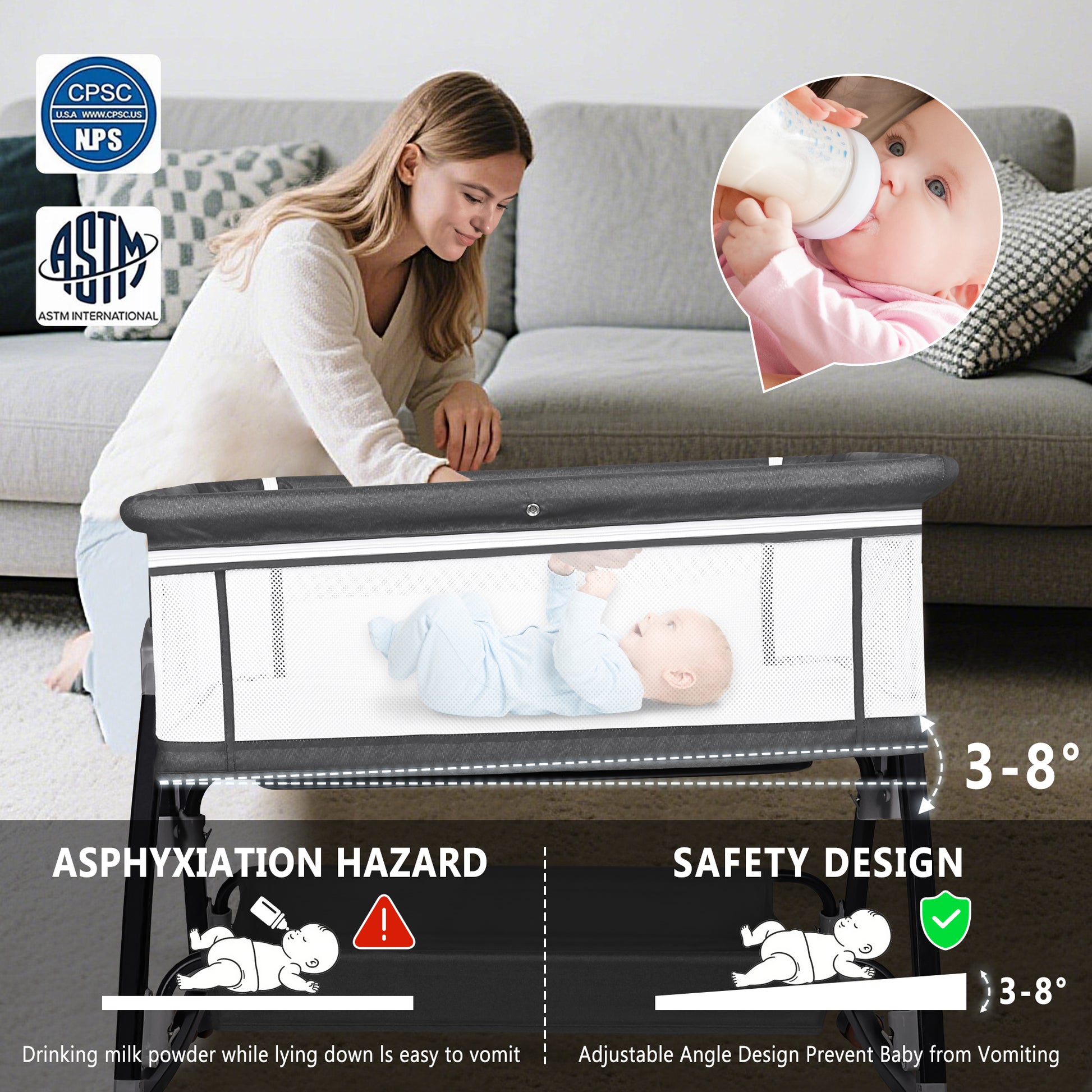 Recumbent Adjustment(3-8° Comply with CPSC)Recumbent adjustment to prevent milk from choking and overflowing,raise one side of the head to 1-2 gears to facilitate feeding and prevent milk from overflowing after meals.