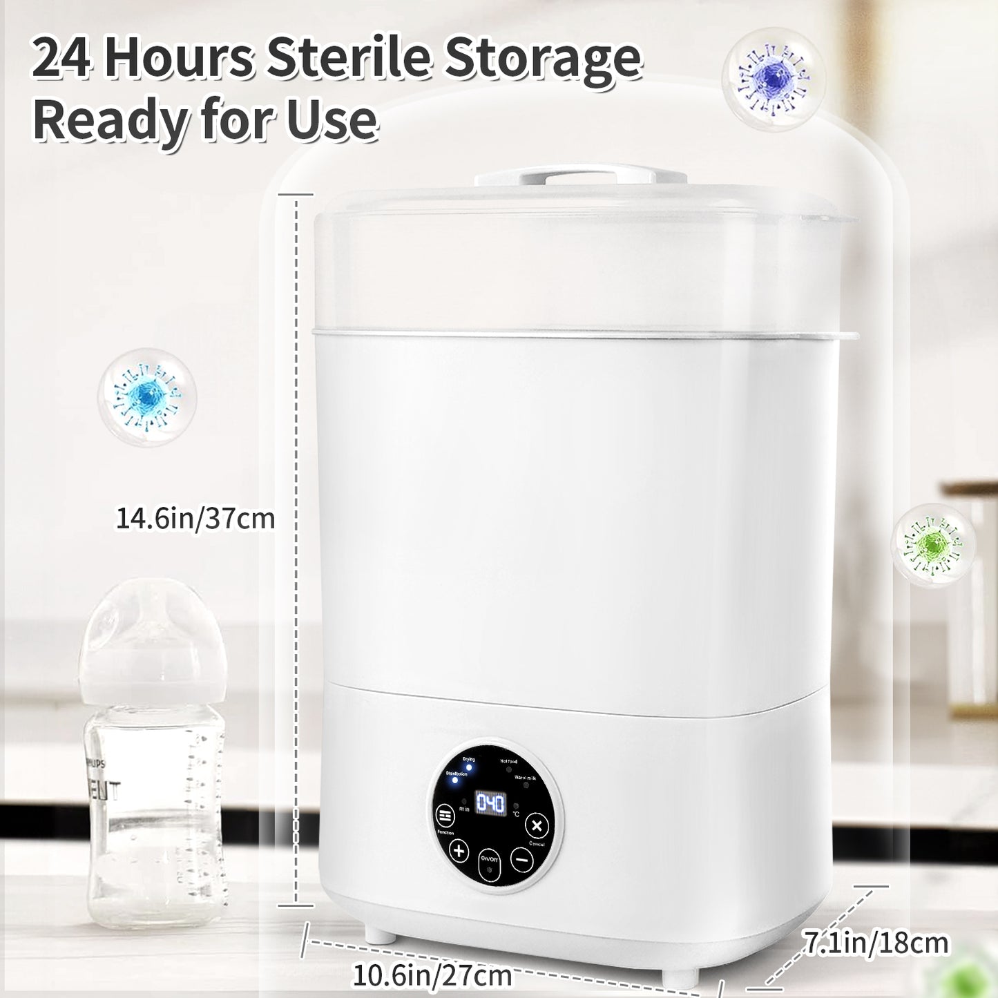 This baby bottle sterilizer and dryer uses high temperature natural steam to kill 99.99% of viruses and bacteria, more hygienic than microwaves and dishwashers.