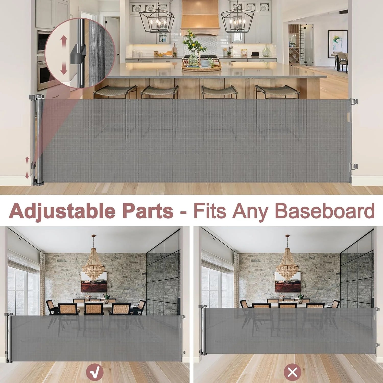 Each set includes 1 extra long retractable baby gate and required mounting accessories. Toddler gate is perfect for Indoor and Outdoor doorways, stairs, hallways, decks, etc.