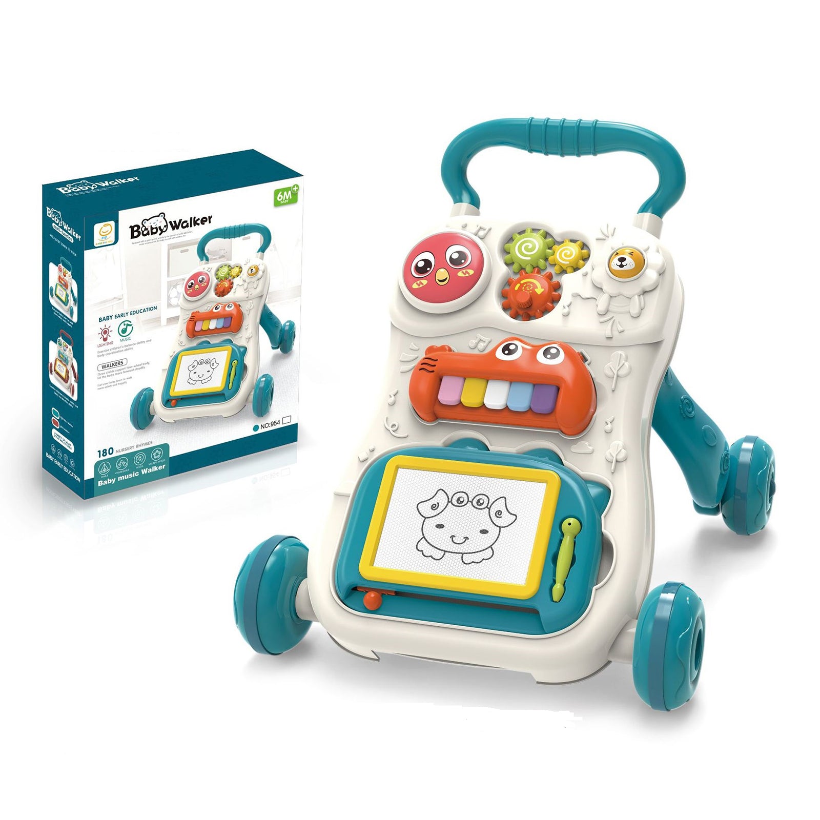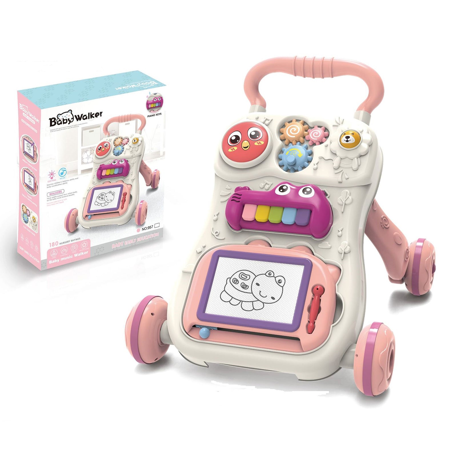 HDJ baby push walker are made of safe and non-toxic ABS material with smooth edges, which measures 15.4*18.1*16.5in/39*47*42cm. This baby walker provides an activity center for babies, including 1 rotating ball, 3 colorful spinning rollers, removable piano keyboard and a drawing board, providing various fun ways to play. The toddler drawing board is a great tool to encourage creativity and imagination. It provides children with a blank canvas to unleash their artistic potential and explore their imagination. This can be a great way for kids to improve their craft skills and prepare them for more advanced art projects in the future. Sit to stand learning walker encourages baby's first steps, developing coordination and strength by pushing the walker forward, learning initial standing and walking. Makes a great birthday gift and newborn gift for babies and toddlers aged 6 months to 3 years.