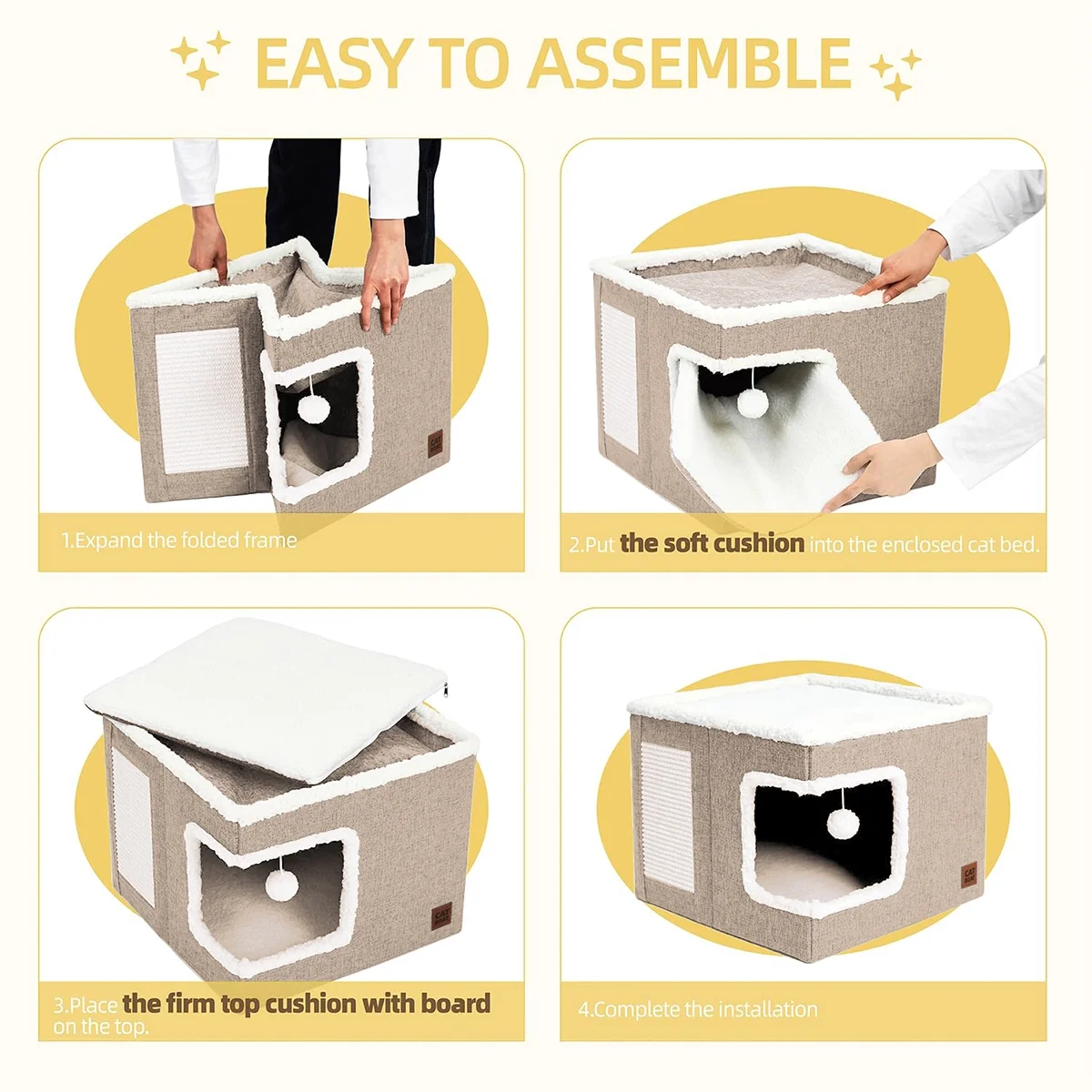 Cat hideaway made from pet-friendly MDF materials with CARB Certification and soft lambswool fabric. This large cat house is equipped with a durable sisal scratching board and plush hanging ball to keep your cat engaged and happy.