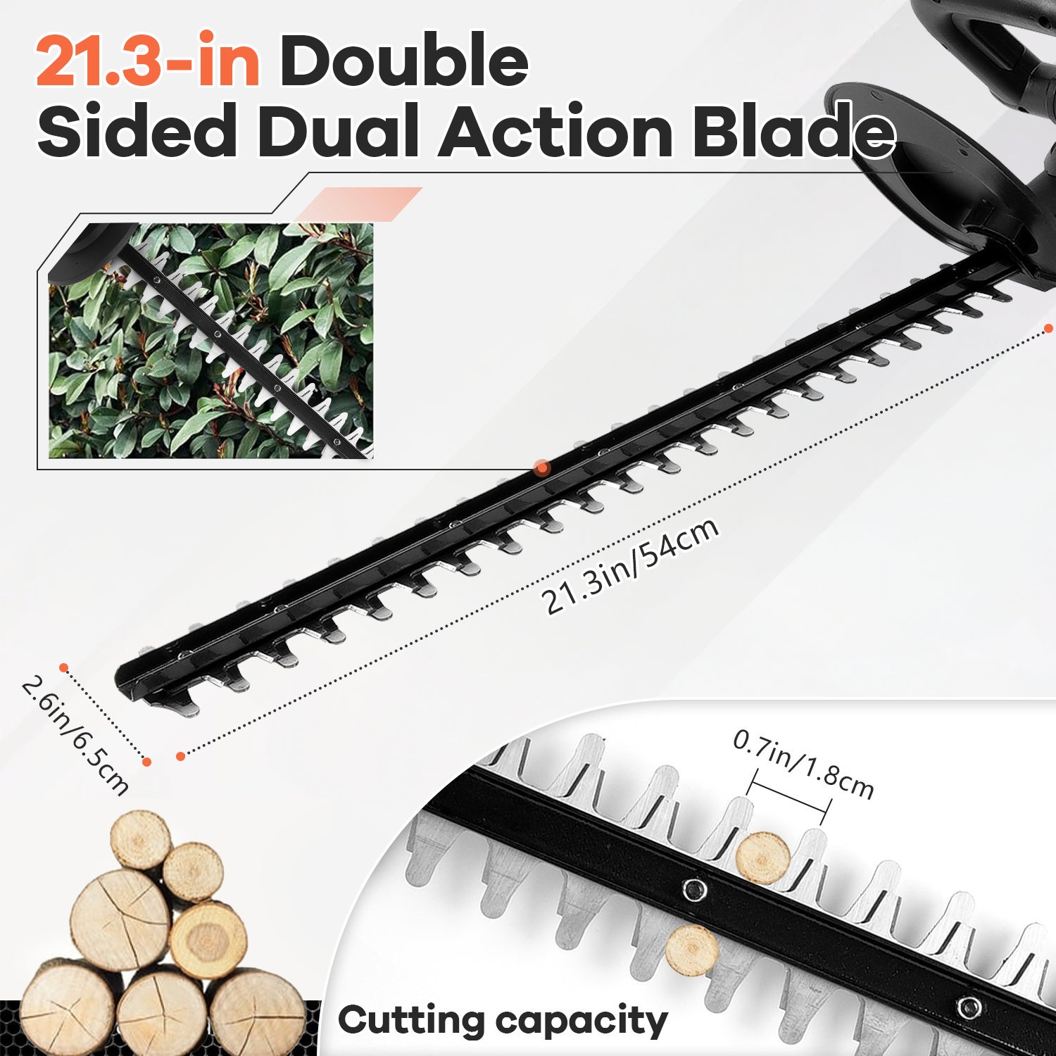 This cordless hedge trimmer features a 21.3 inch dual-action laser blade with a 0.7-inch cutting diameter—it can cut through most small to medium-sized trees with ease; Equipped with a powerful motor with no-load speeds up to 1300 rpm, this hedge trimmer can deliver optimal and efficient results under almost all working conditions.