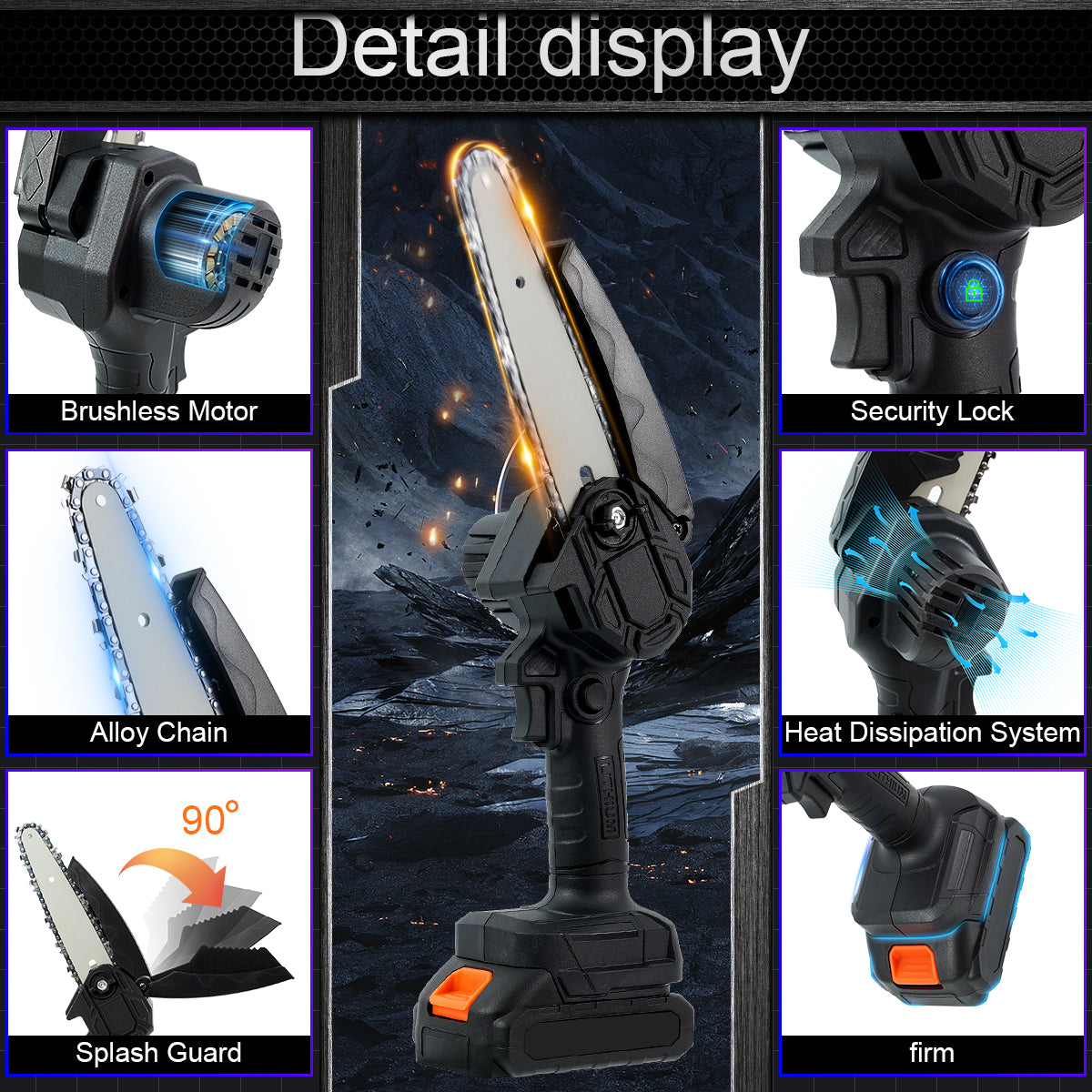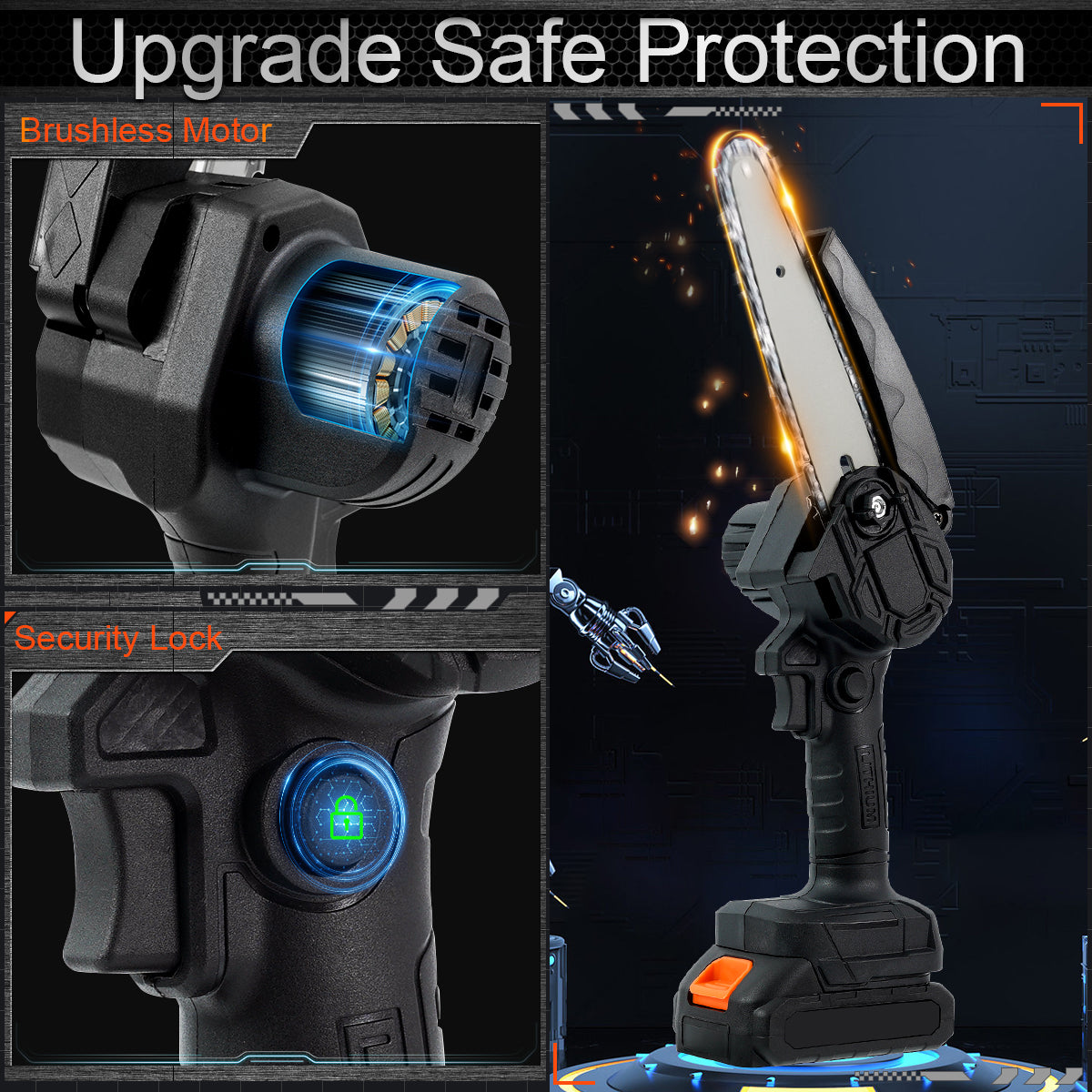 security measures to ensure that the Handheld chainsaw has reliable safety: Switch lock to prevent accidental activation to protect your family. It adds a safety cover flip to prevent wood splashing. Safe with Chain Brake - The chain stops precisely for more safety and accurate cut.