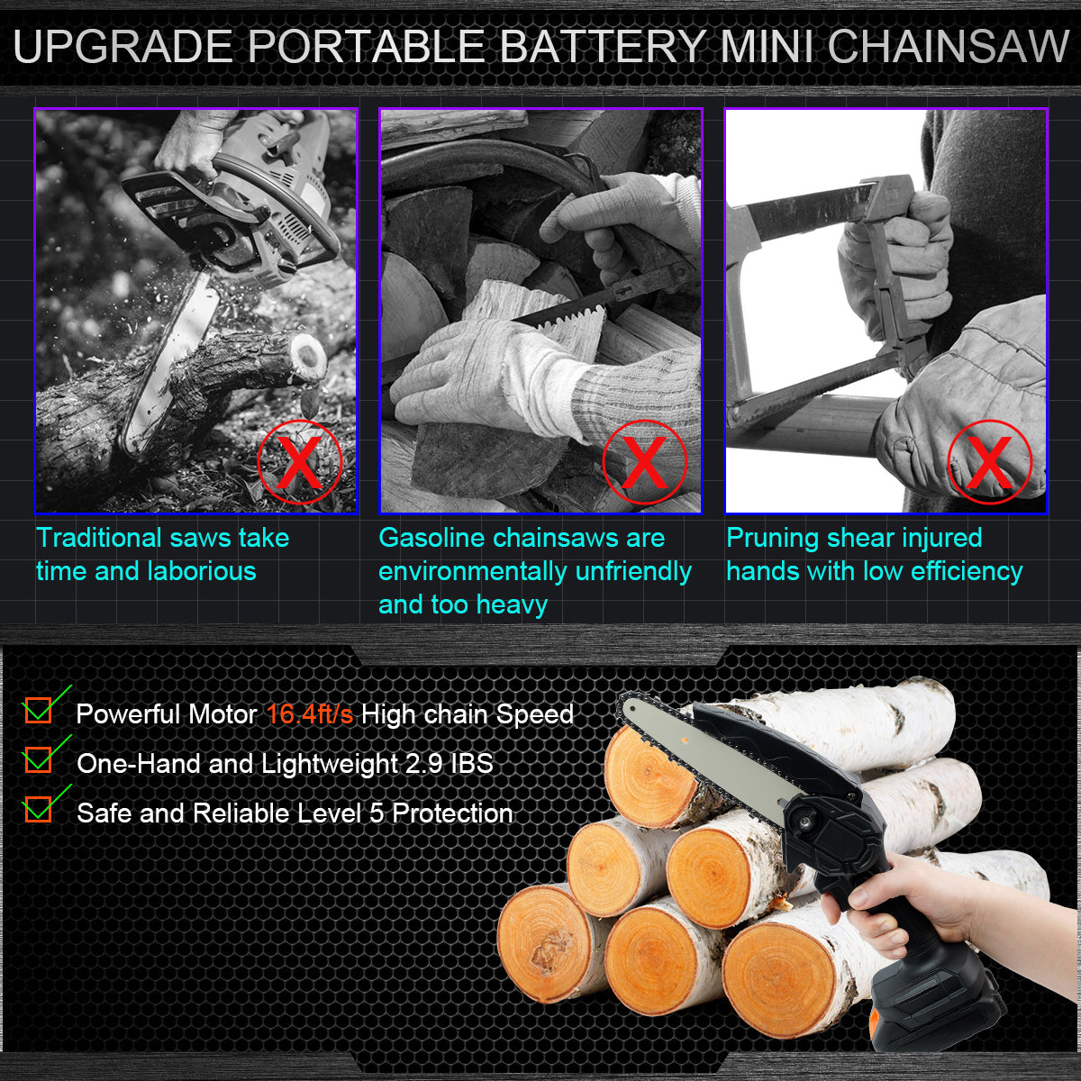 Provides your tool with longer run-time, more torque, and more power. 16.4 ft/sec ultra-high chain speed takes only about 8 seconds to cut a 6" diameter log. ONE-HAND USE - Due to its 2.9lb slim body, small in size, comfortable to hold, and convenient access to all places. Very suitable for women and the elderly, and will not feel tired after a long time of use.