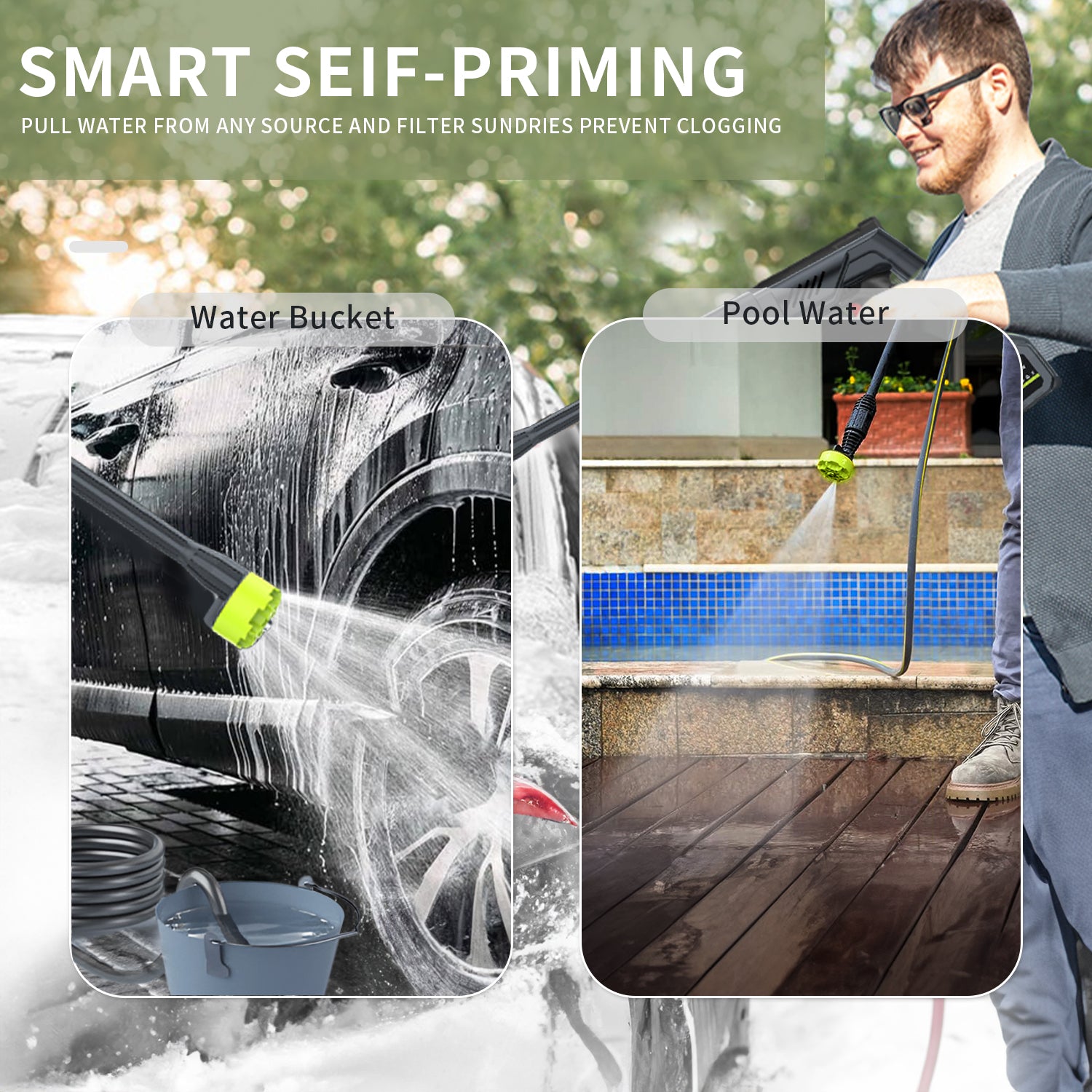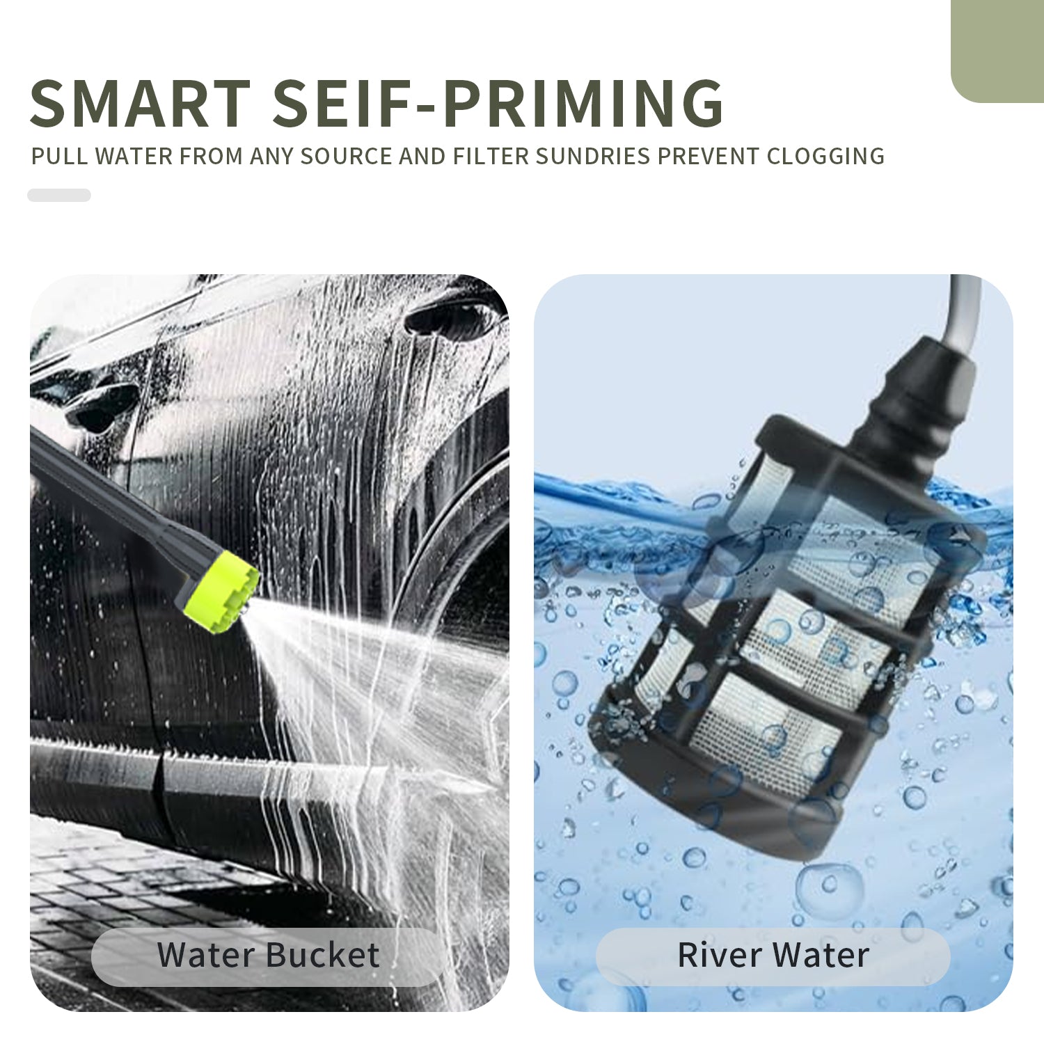 Portable pressure washer equipped with two large-capacity battery (Please charge before use) provides mobile power for the washer. Please be careful not to let water into the battery during use. The self-priming function allows the cordless washer to absorb water from faucets, bottles, buckets, pools, and other places.(The package does not come with a garden hose quick connector)