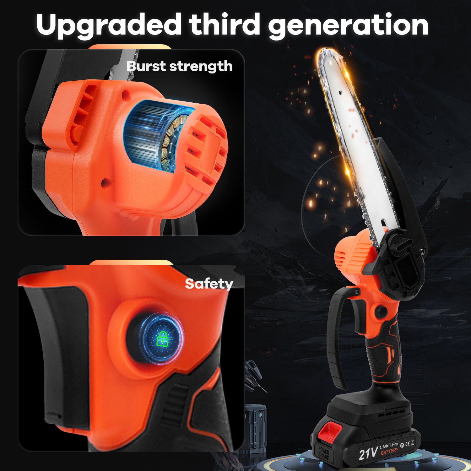 Brushless Motor. Cordless mini chainsaw has a powerful brushless motor inside, which increases lifespan by 90%, output power by 80%, and reduces energy consumption by 50%, giving your cutting work with no jam, low noise and high efficiency. Multiple Security Protection Upgraded cordless mini chainsaw features with 90°rotatable top guard baffle and bottom handle guard baffle, lock-off button plus rubberized and ergonomic grips for user's safety. You need to simultaneously press the safety button and the switch at to start the mini chainsaw. Prevent the chain from accidentally engaging. While the rubberized handle makes you more comfortable to hold and easier to control, achieving well-balanced with a high cutting performance. High-quality Manganese Steel Chain. The chainsaw is equipped with a high-quality manganese steel chain that has undergone a deep quenching process to ensure smooth cutting. One-Hand Operated & Compact Handheld electric chainsaw is lightweight, reducing arm fatigue while cutting, makes it not only easier to one-handed operation, but also safer than heavier chainsaw. Its small size also allows it to fit into tight or awkward spaces that larger saws could not, like between tree branches, or into brush piles. 2PCS 1.5Ah Batteries We know that the battery life of the mini cordless chainsaw is your most important concern. Our Rechargeable electric saw is equipped with 2 Pack 1.5Ah batteries which can hold a charge for a long time. Rechargeable batteries with self-overload and temperature protection provide a much longer battery life.