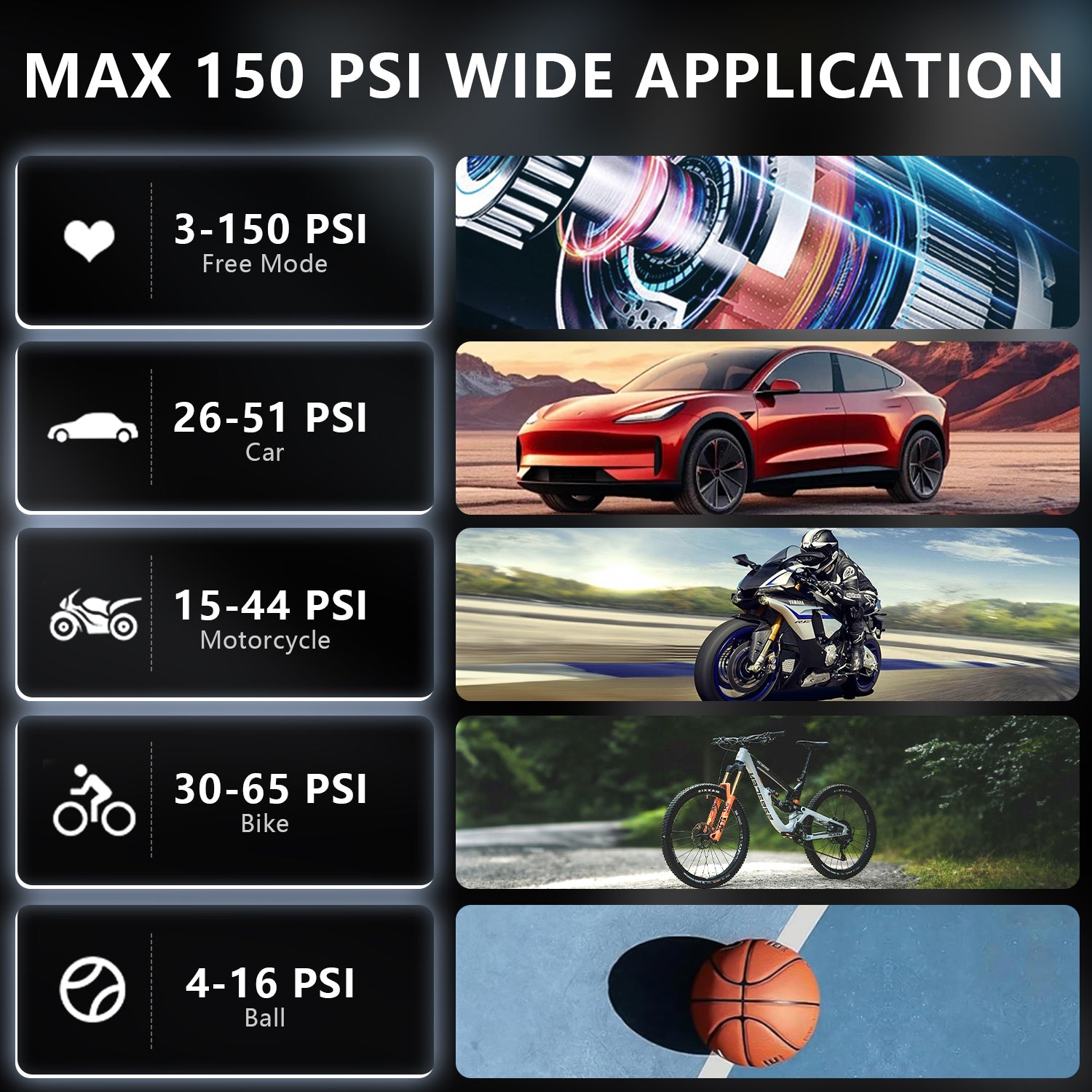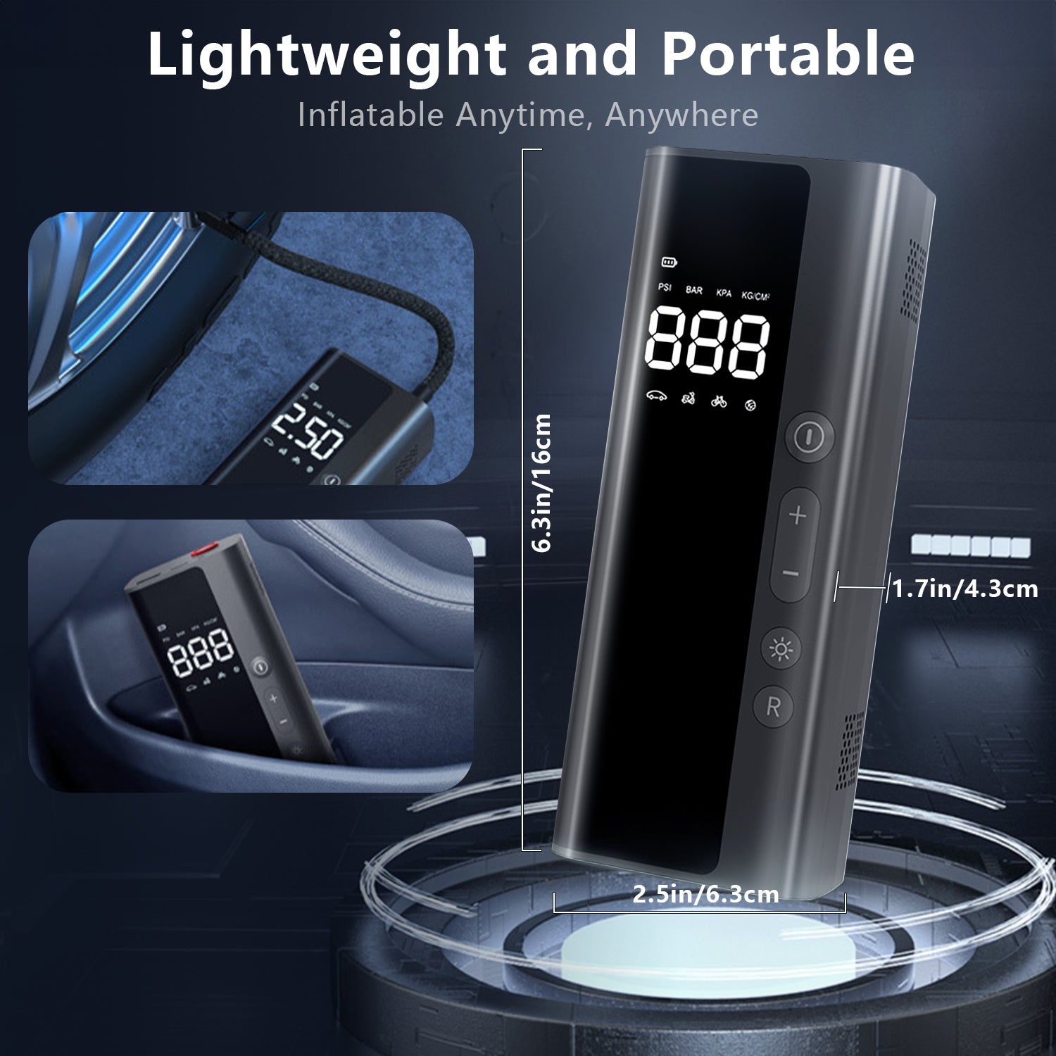 Built-in 8000mAh rechargeable high-capacity battery, tire inflator portable air compressor does not require an external power supply while working. Refer to turbo design and equipped with a high-performance chip, this portable air compressor for car tires can provide up to 150 psi pressure.