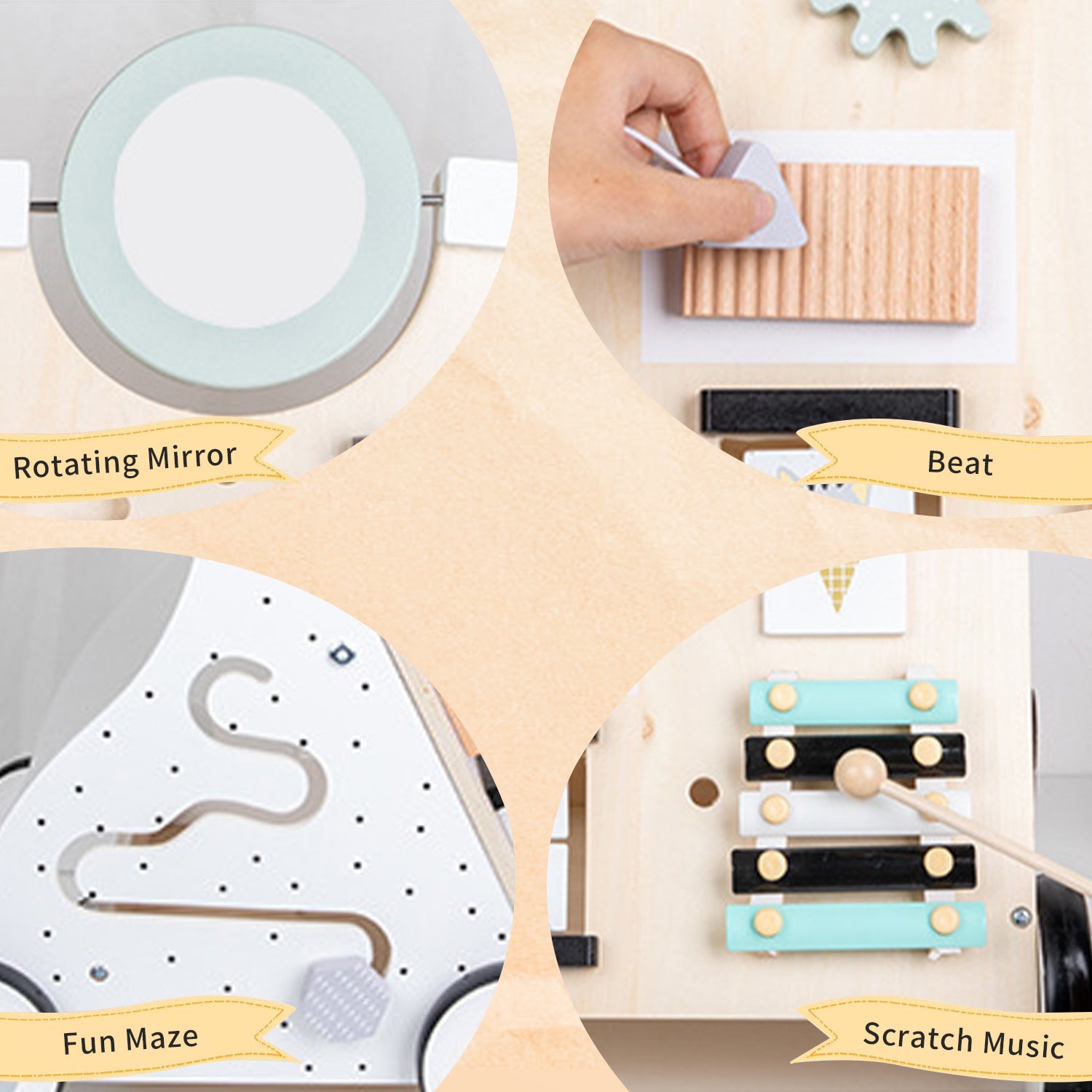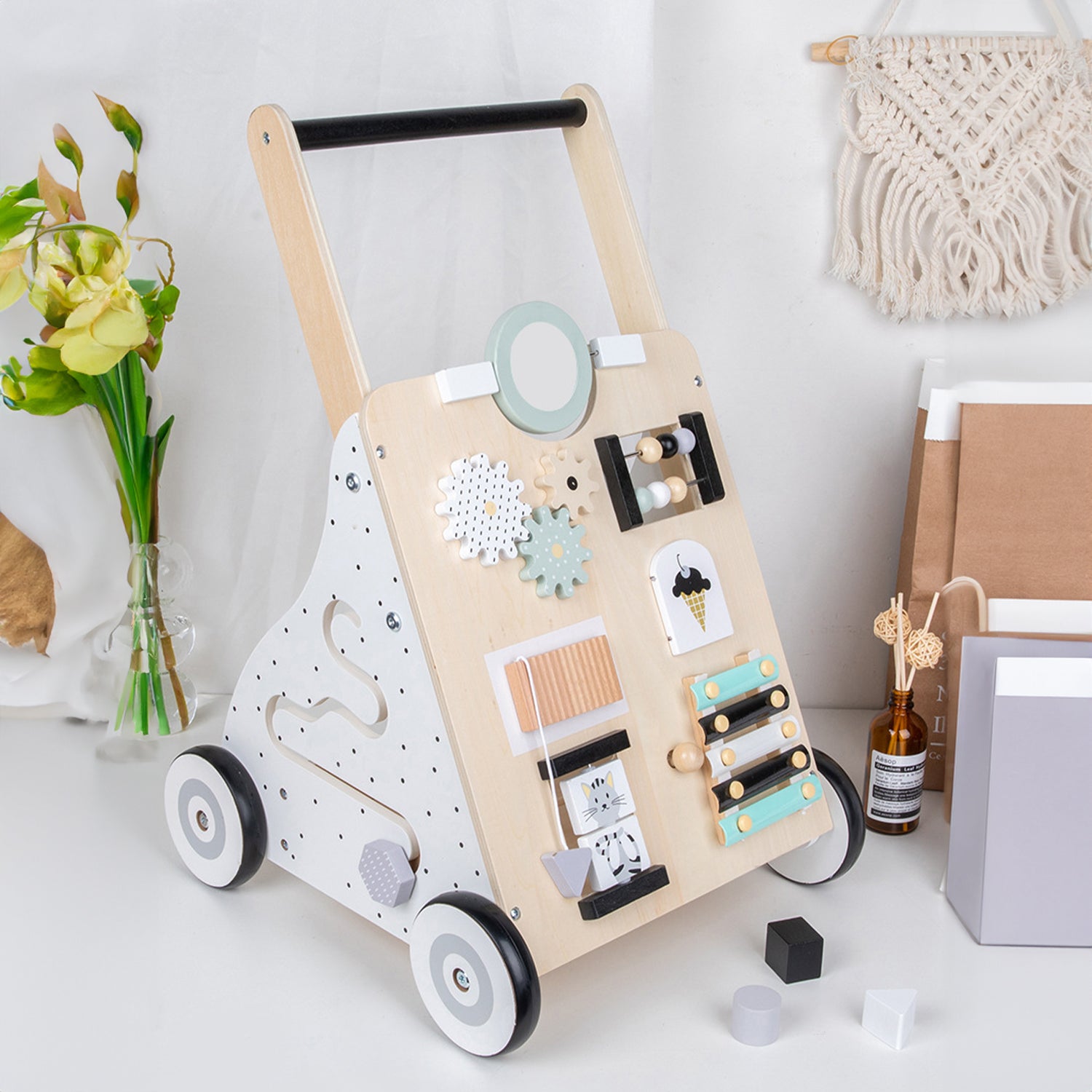 HDJ Baby walker is made with top quality wooden craftsmanship, rubber edges on wheels which protect your delicate floors and non-toxic paints, this kids’ activity toy is guaranteed to withstand the test of time! This push and pull walker comes with countless fun activities for your toddler to enjoy, including rotary gear, shape classifier, flip bear, turn beads, puzzle board, etc. and storage space on the back for your baby's favourite toys or books. This activity center for toddlers stimulates creativity, develops imagination, helping improve the little one’s motor and social skills. The sturdy frame is excellent for providing the needed support for the baby’s first steps!